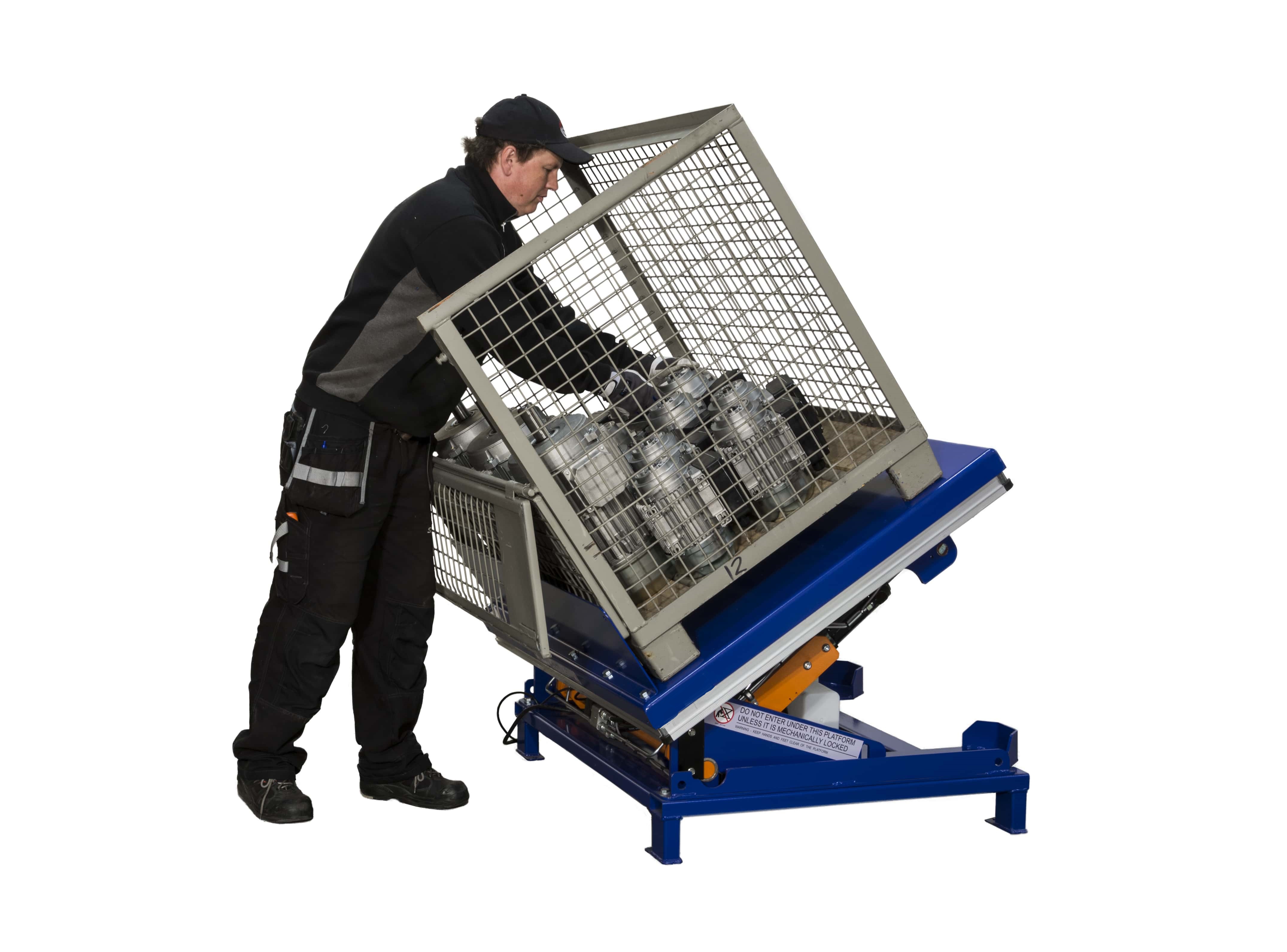 Ein großer Vorteil dieser Hub-Neigegeräte ist ihre Eignung für hohe Paletten, Kisten und Container, da die Neigung abwärts erfolgt.