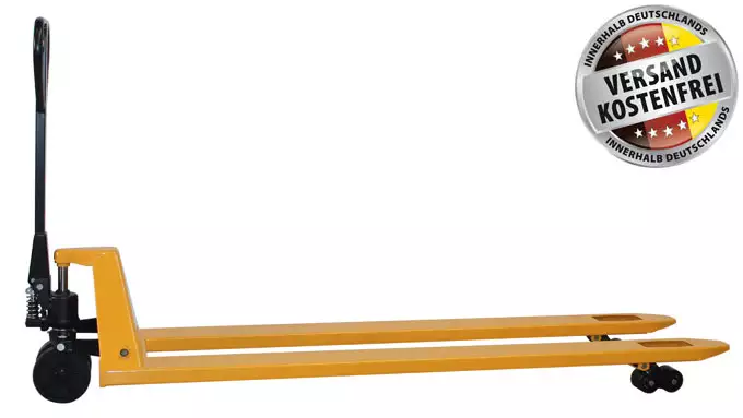 Der WOSE Handgabelhubwagen ist ideal zum Transport von Sonderpaletten. Mit einer Tragfähigkeit von 2.000 kg hebt der Hubwagen jede Palette im Handumdrehen. Dank seiner Gabellänge von 2.000 mm und einem Gabelaußenabstand von 540 mm, lässt sich jede Palette leich bewegen.