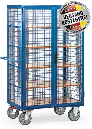 - Der Kastenwagen 5393 mit Gitterwänden hat eine Tragkraft von 750 kg. Die stabile Winkelstahl-Konstruktion mit Rohrschiebegriff ist pulverbeschichtet.