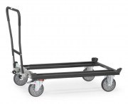 Paletten-Fahrgestell 22801 / 7016 für Flachpaletten und Gitterboxen. Robuste Winkelstahl-Schweißkonstruktion, mit 4 Fangecken, pulverbeschichtet, anthrazitgrau RAL 7016. 2 Lenk- und 2 Bockrollen, TPE-Bereifung, Naben mit Rillenkugellager, Feststeller an den Lenkrollen, gemäß der europäischen Norm EN 1757-3 (Sicherheit von Plattformwagen). Standard-Beräderung für mittlere Belastungen. Geräuscharmer Lauf.