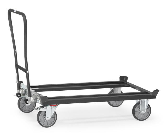Das Paletten-Fahrgestell 23891 / 7016 verfügt über eine robuste Winkelstahl-Schweißkonstruktion mit vier stabilen Fangecken und kann Lasten bis 1.050 kg befördern.