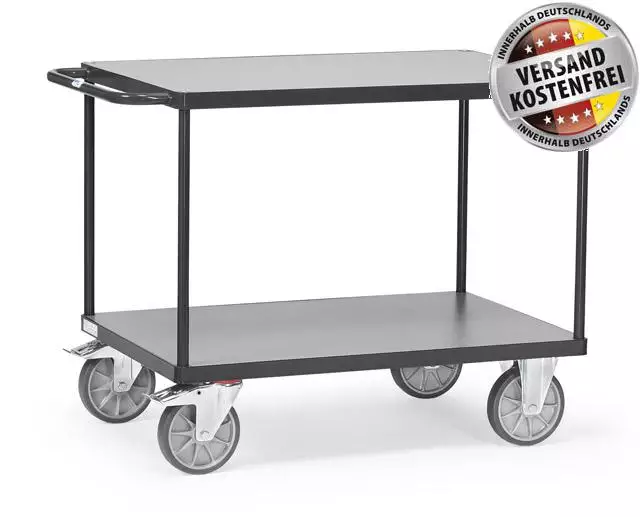 In puncto Sicherheit erfüllt der Tischwagen die strengen Anforderungen der Europäischen Norm EN 1757-3 für Plattformwagen und verfügt über praktische Feststeller an den Lenkrollen.