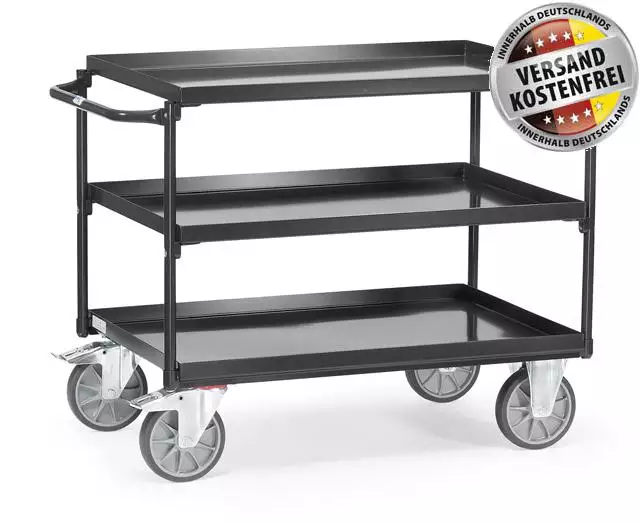 Der pulverbeschichtete Tischwagen 4832 / 7016 hat eine geschweißte Stahlkonstruktion und verfügt über 3 Stahlblechwannen. Der Stahlrohrbügel und die öldichten Stahlblechwannen sind verschraubt, der Rand der Wannen ist 40 mm hoch und der Schiebegriff ist waagerecht angebracht.